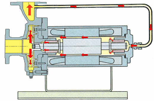 这种型式的屏蔽泵,其轴承润滑、冷却和电动机冷却的液体流动方向与基本型正好相反。 逆循环型泵的主要特点是不易产生汽蚀,适合输送易汽化的液体,有时也称之为易汽化型。